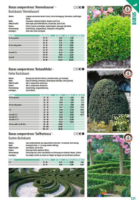 Verwendung: Einfassungs-Bux, daher ausschließlich zur Einfassung von Rabatten, Wegen, Gräbern.
