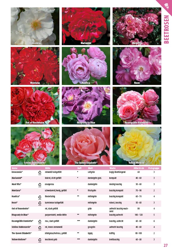 Name Blüte Duft Blatt Wuchs Höhe in cm Preisgruppe