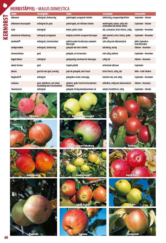Geheimrat Oldenburg mittelgroß, hochgebaut hellgelb, bei Reife orangerot überzogen mild säuerlich, festes Fleisch, später