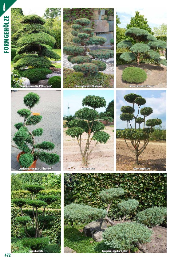 Juniperus media 'Pfitzeriana' Juniperus virginiana 'Grey Owl' Taxus baccata Pinus sylvestris 'Watereri' Cornus mas Juniperus media 'Hetzii' Pinus sylvestris 'Glauca' Acer campestre 472 FORMGEHÖLZE