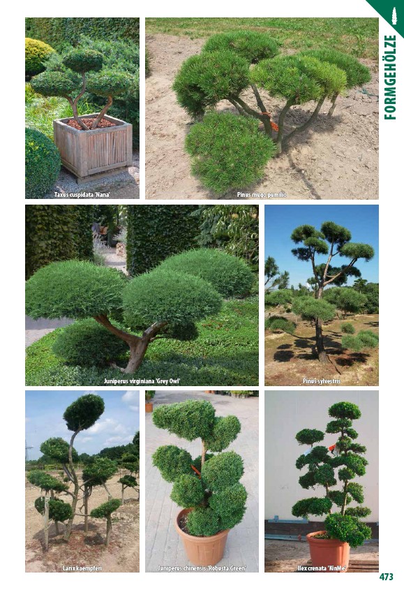 Taxus cuspidata 'Nana' Pinus mugo pumilio Juniperus virginiana 'Grey Owl' Pinus sylvestris Larix kaempferi Juniperus chinensis 'Robusta Green' Ilex crenata 'KinMe' FORMGEHÖLZE 473