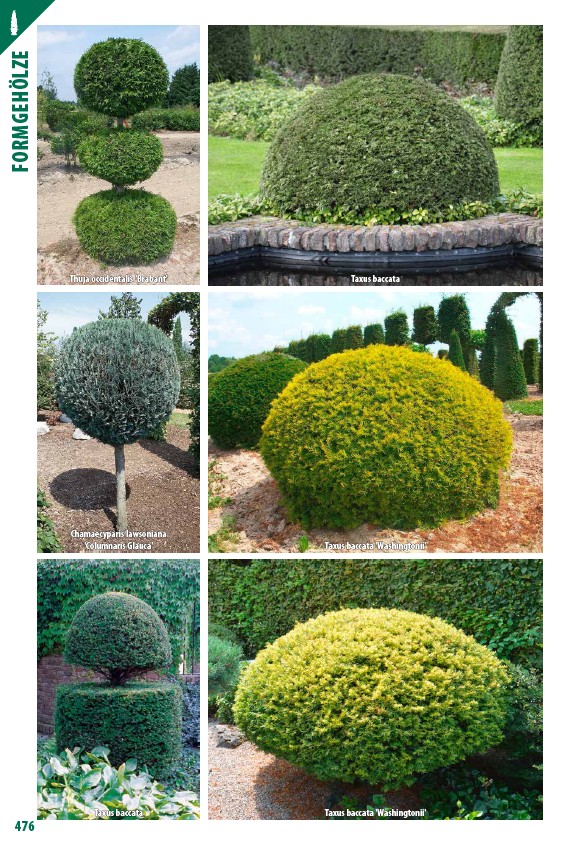 Thuja occidentalis 'Brabant' Chamaecyparis lawsoniana 'Columnaris Glauca' Taxus baccata Taxus baccata Taxus baccata 'Washingtonii' Taxus baccata 'Washingtonii' 476 FORMGEHÖLZE
