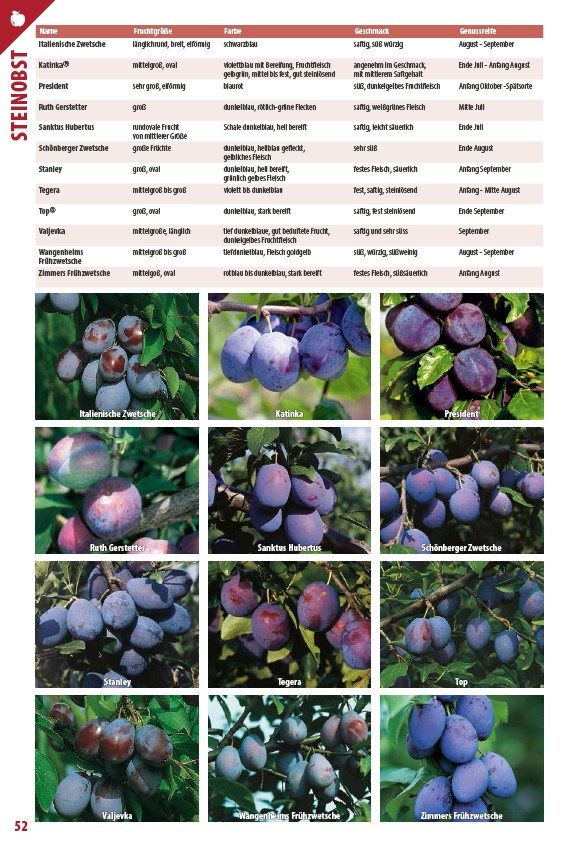 Zimmers Frühzwetsche mittelgoß, oval rotblau bis dunkelblau, stark bereift festes Fleisch, süßsäuerlich Anfang August