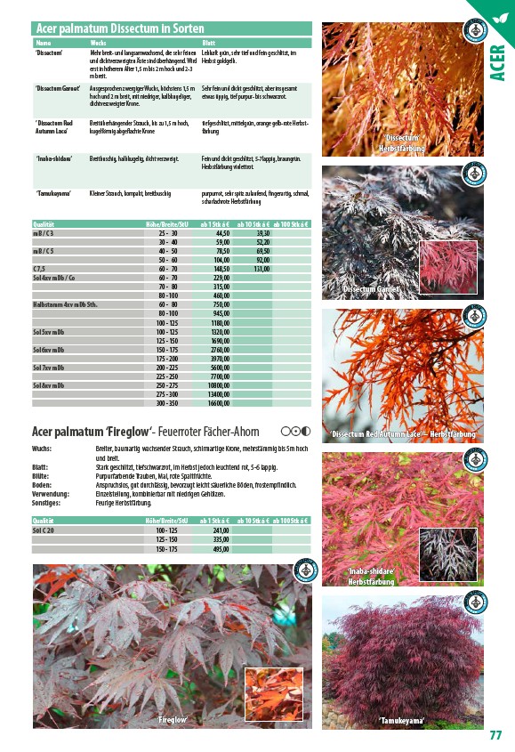 ‘Inaba-shidare‘ Breitbuschig, halbkugelig, dicht verzweigt. Fein und dicht geschlitzt, 5-7lappig, braungrün.